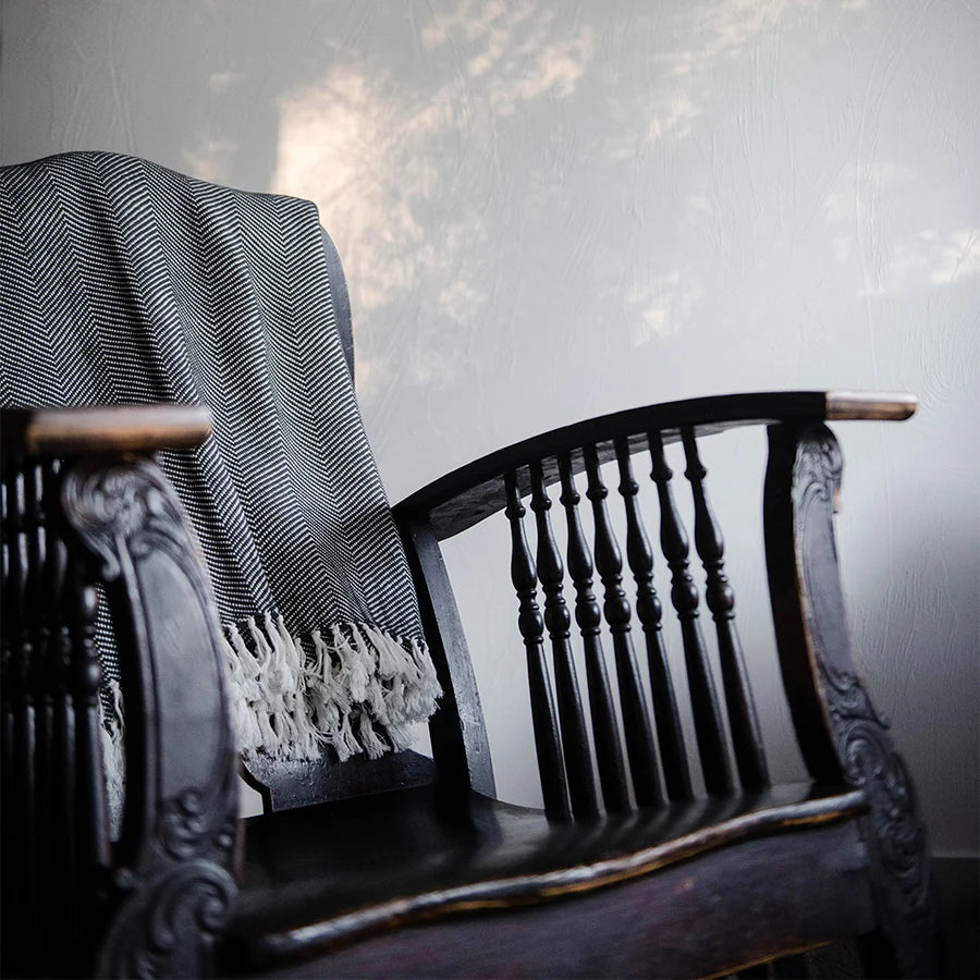 This collection is entirely handmade of hand-spun and hand-dyed cotton. The Norris blanket is beautifully hand-woven on four harness looms to create the herringbone design. They are made entirely of Ethiopian cotton with tied fringes.